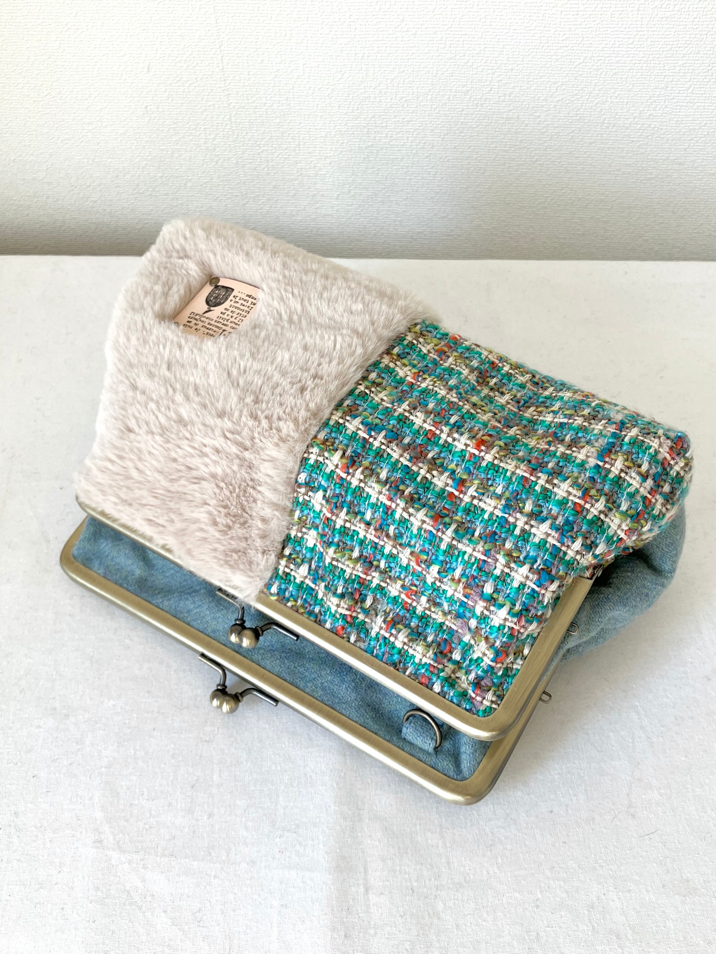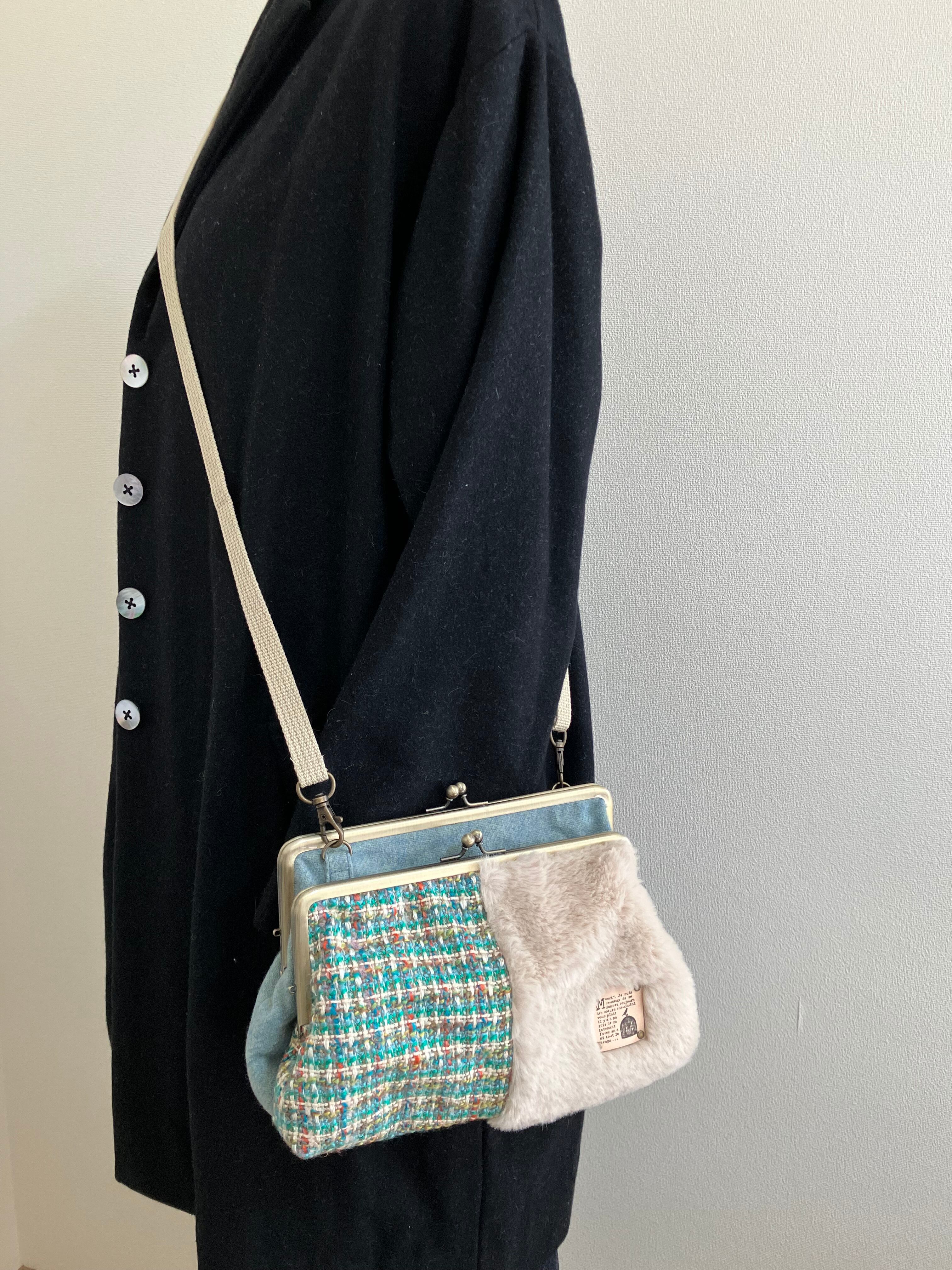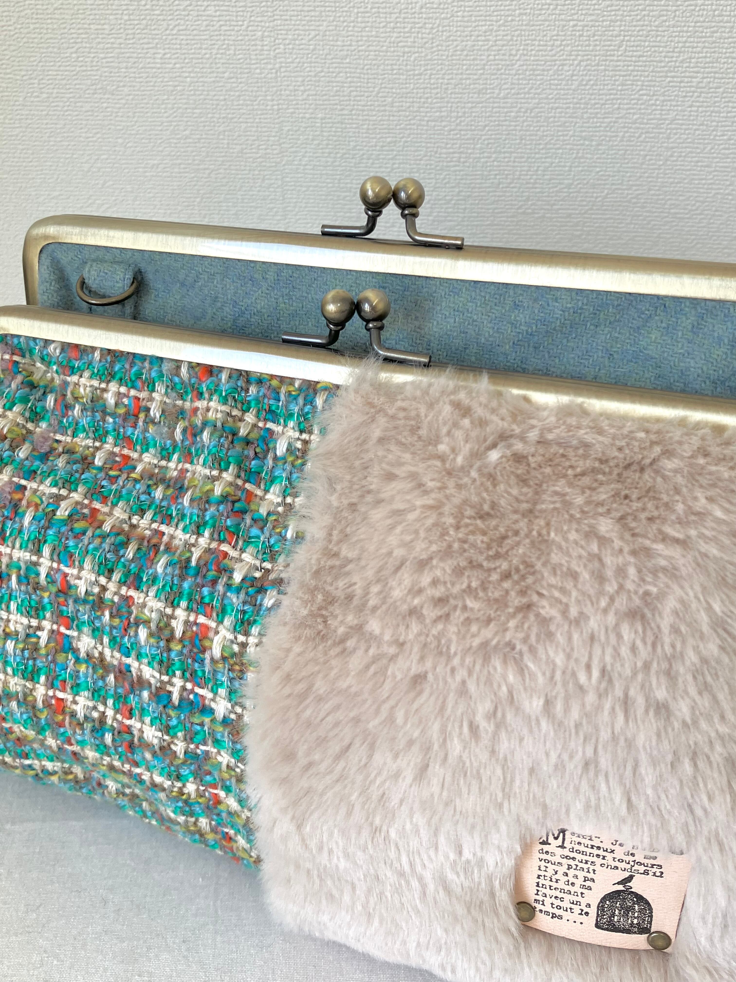 ダブルがま口バッグMサイズ(グリーン系ツイード×ファー) 持ち手別売り