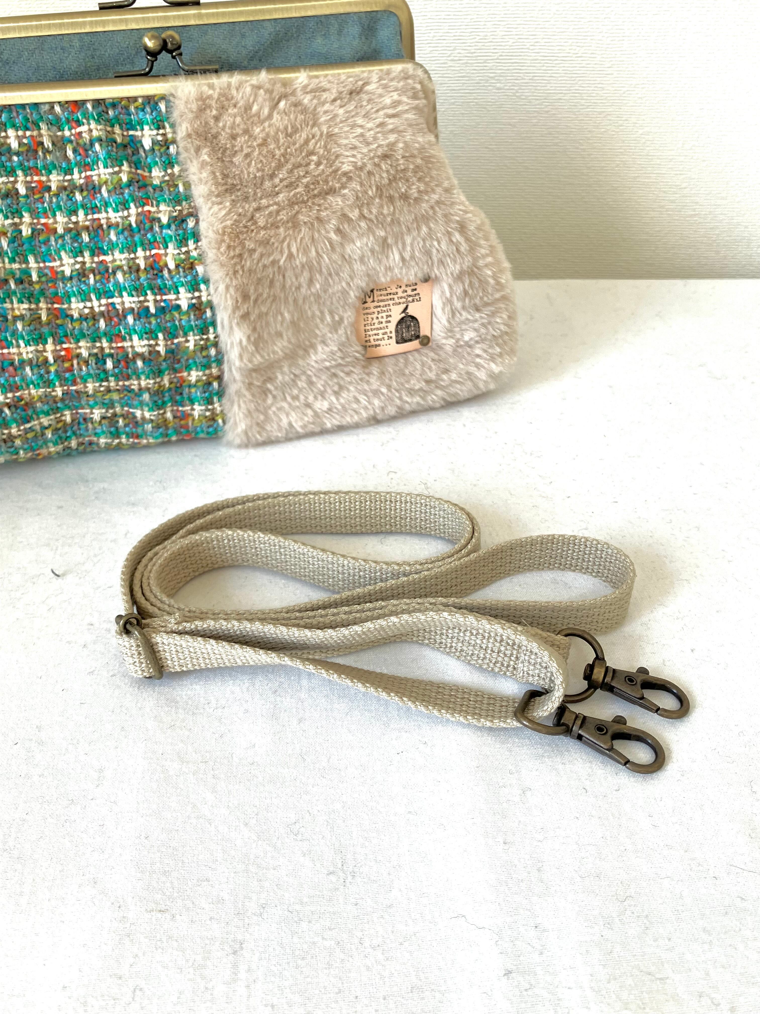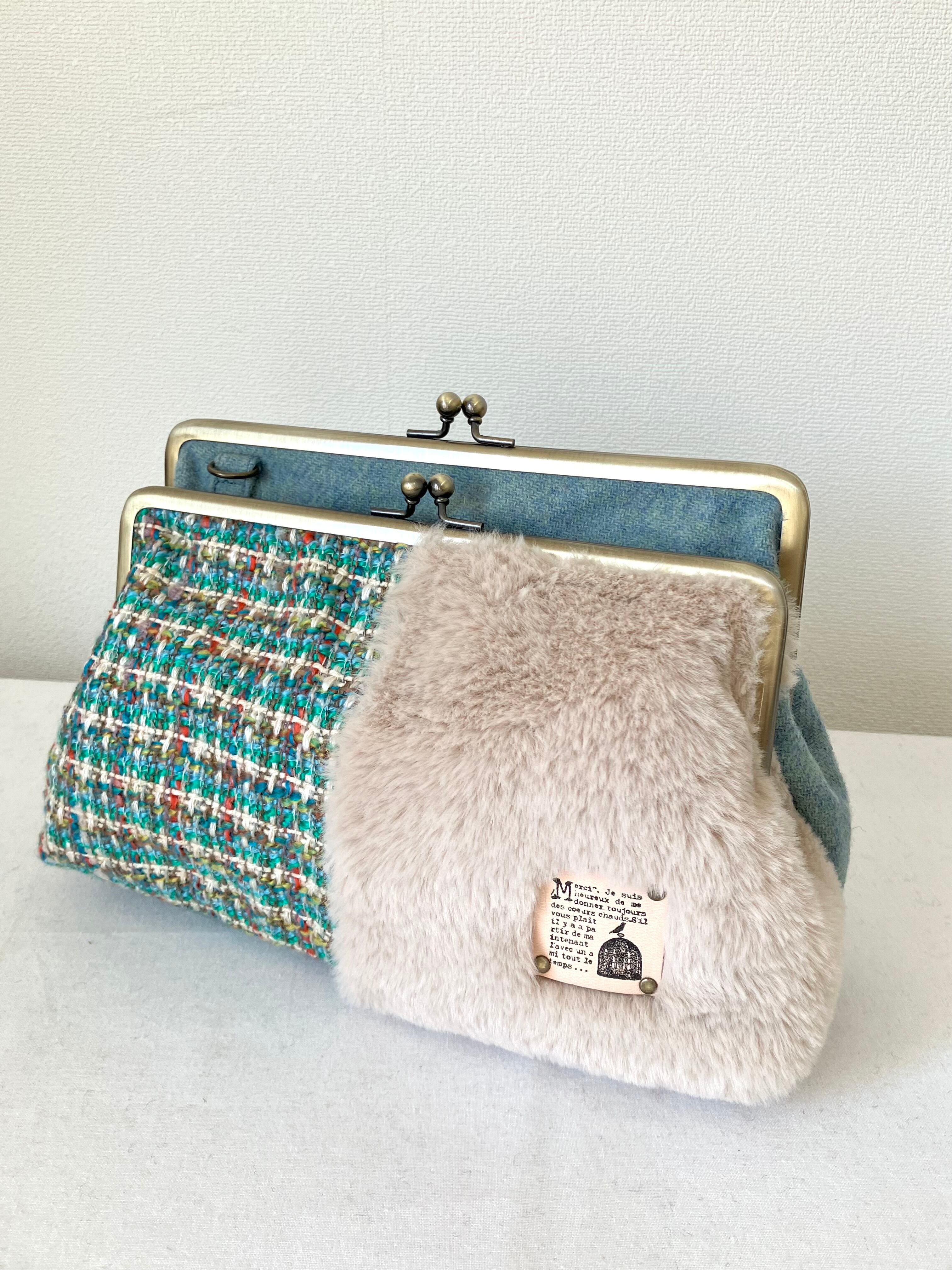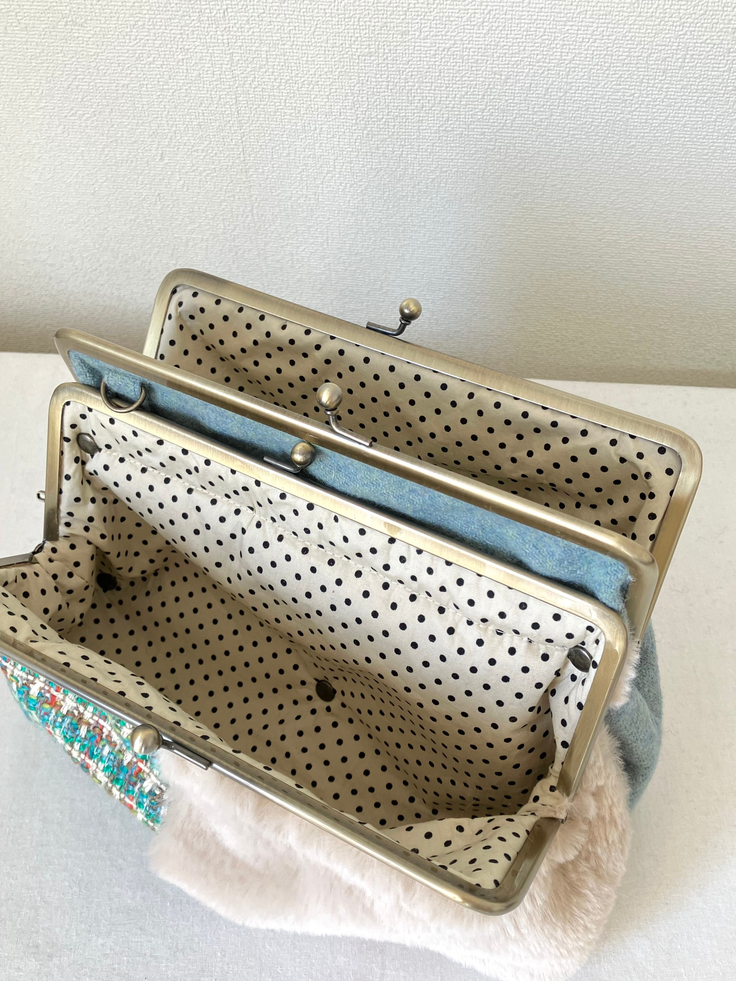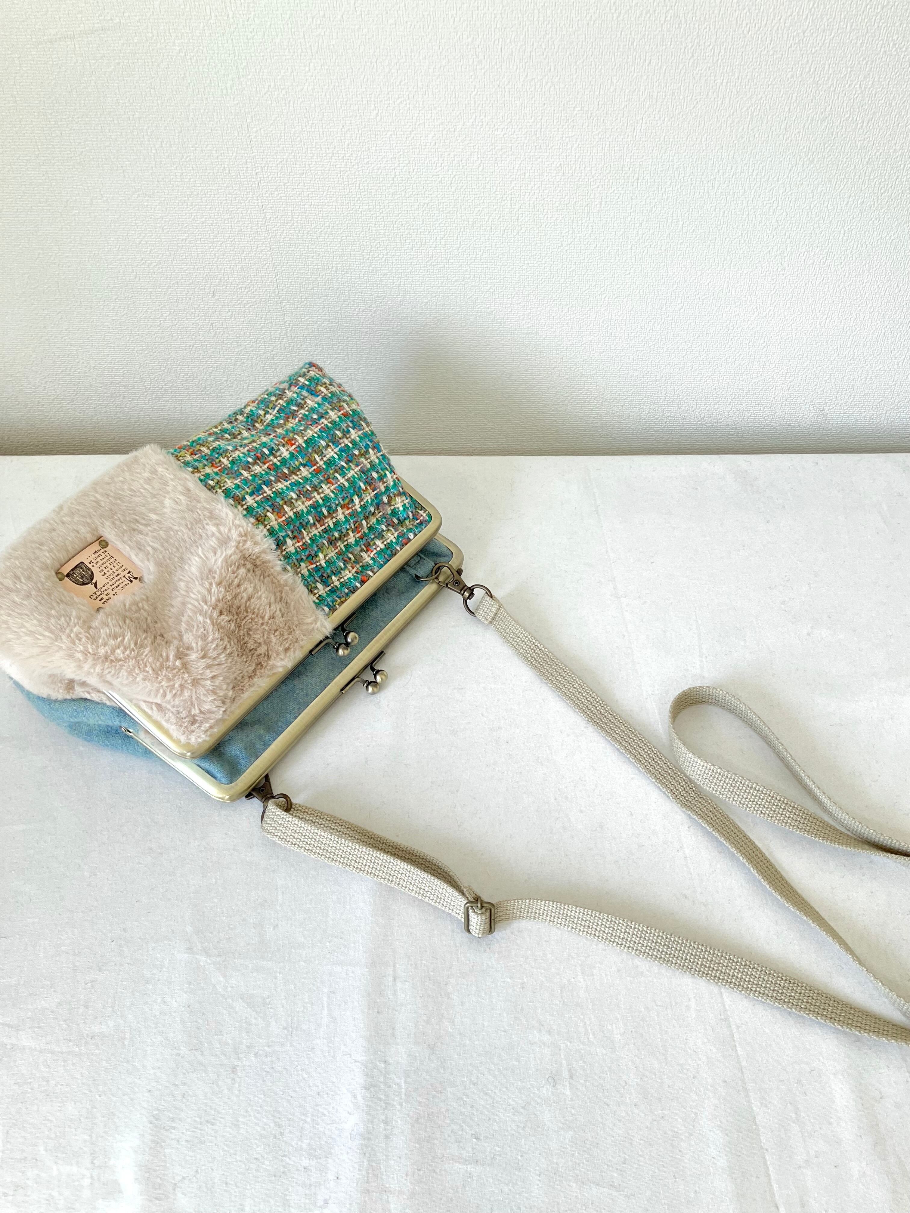 ダブルがま口バッグMサイズ(グリーン系ツイード×ファー) 持ち手別売り