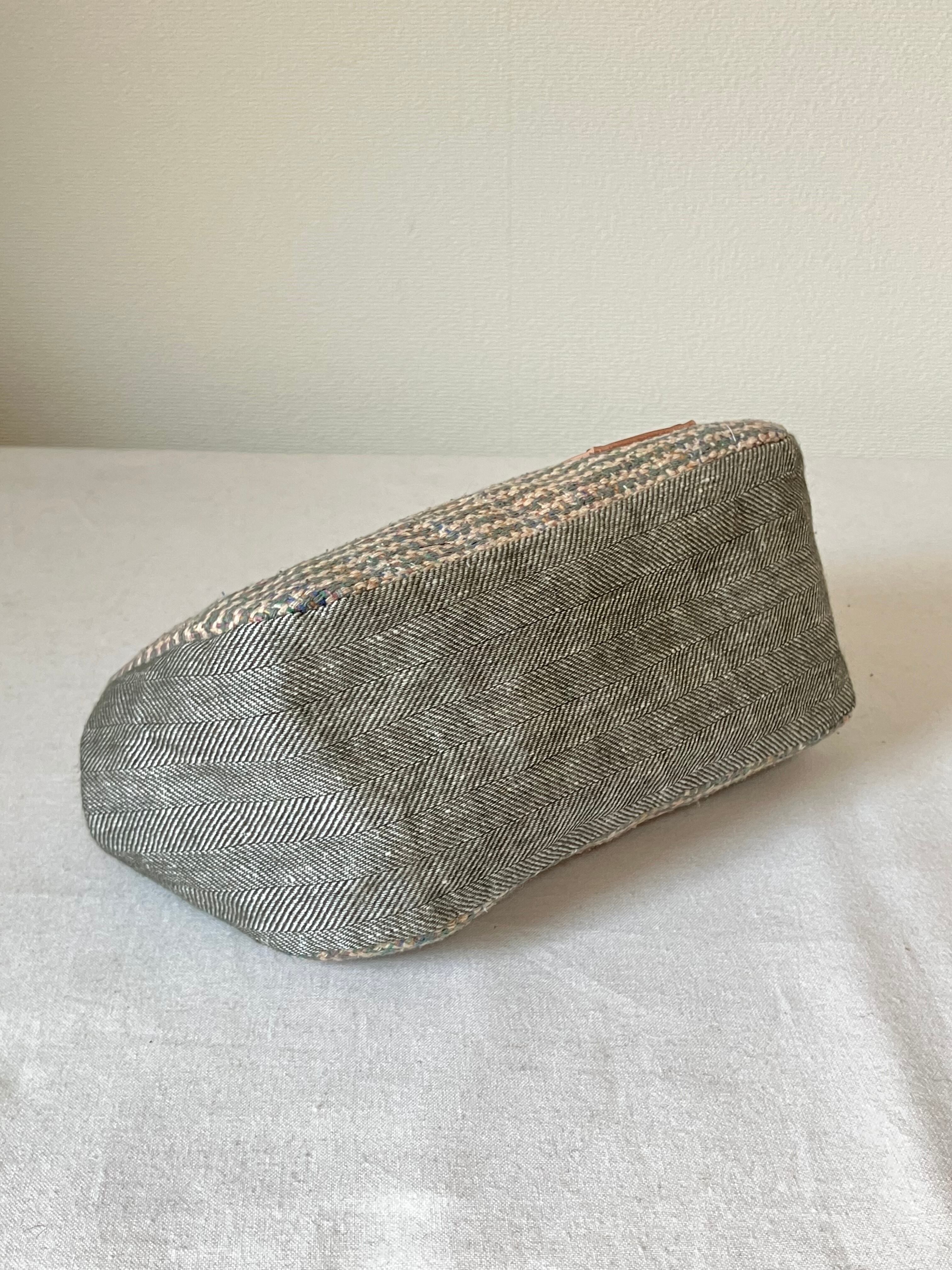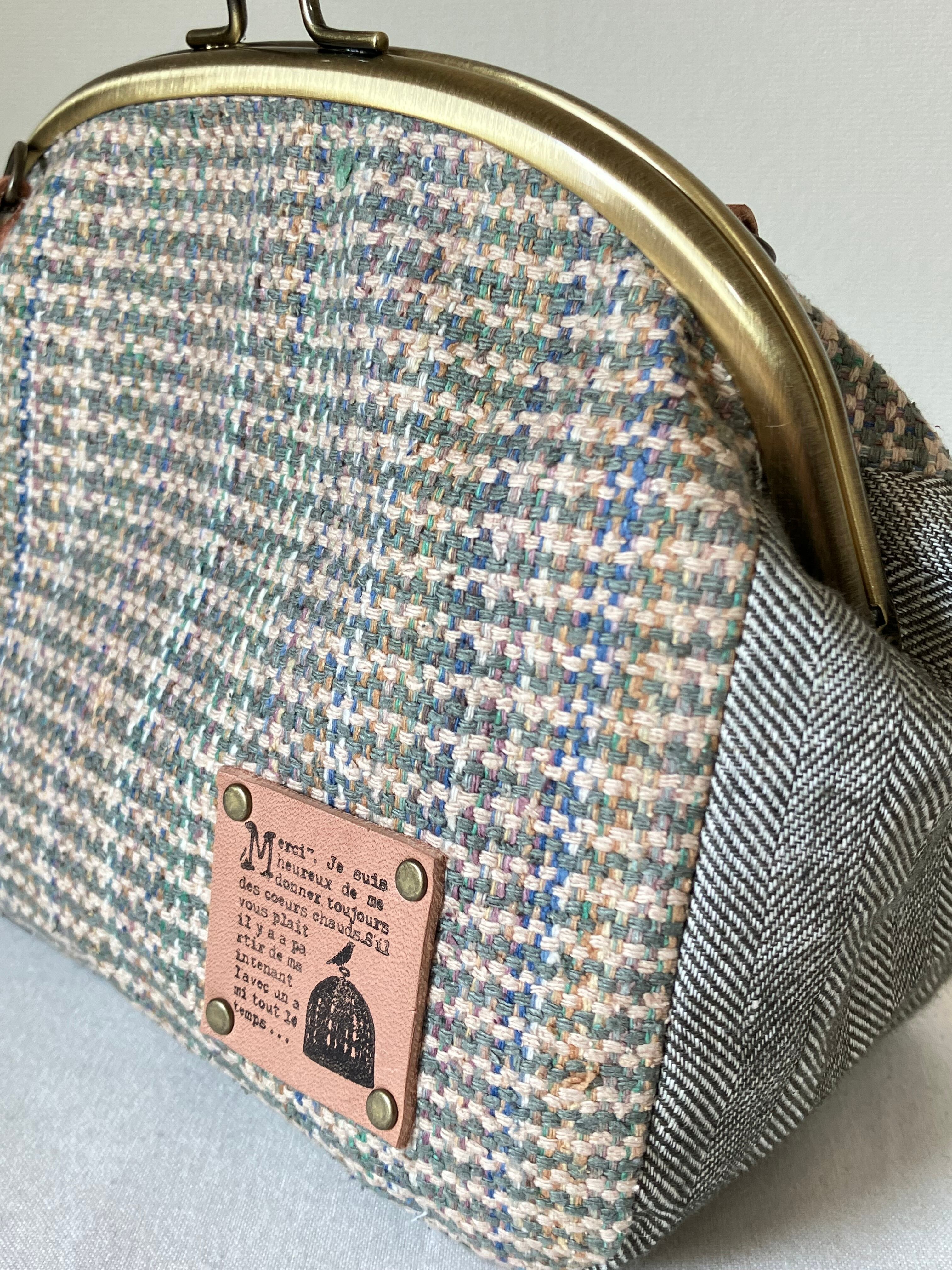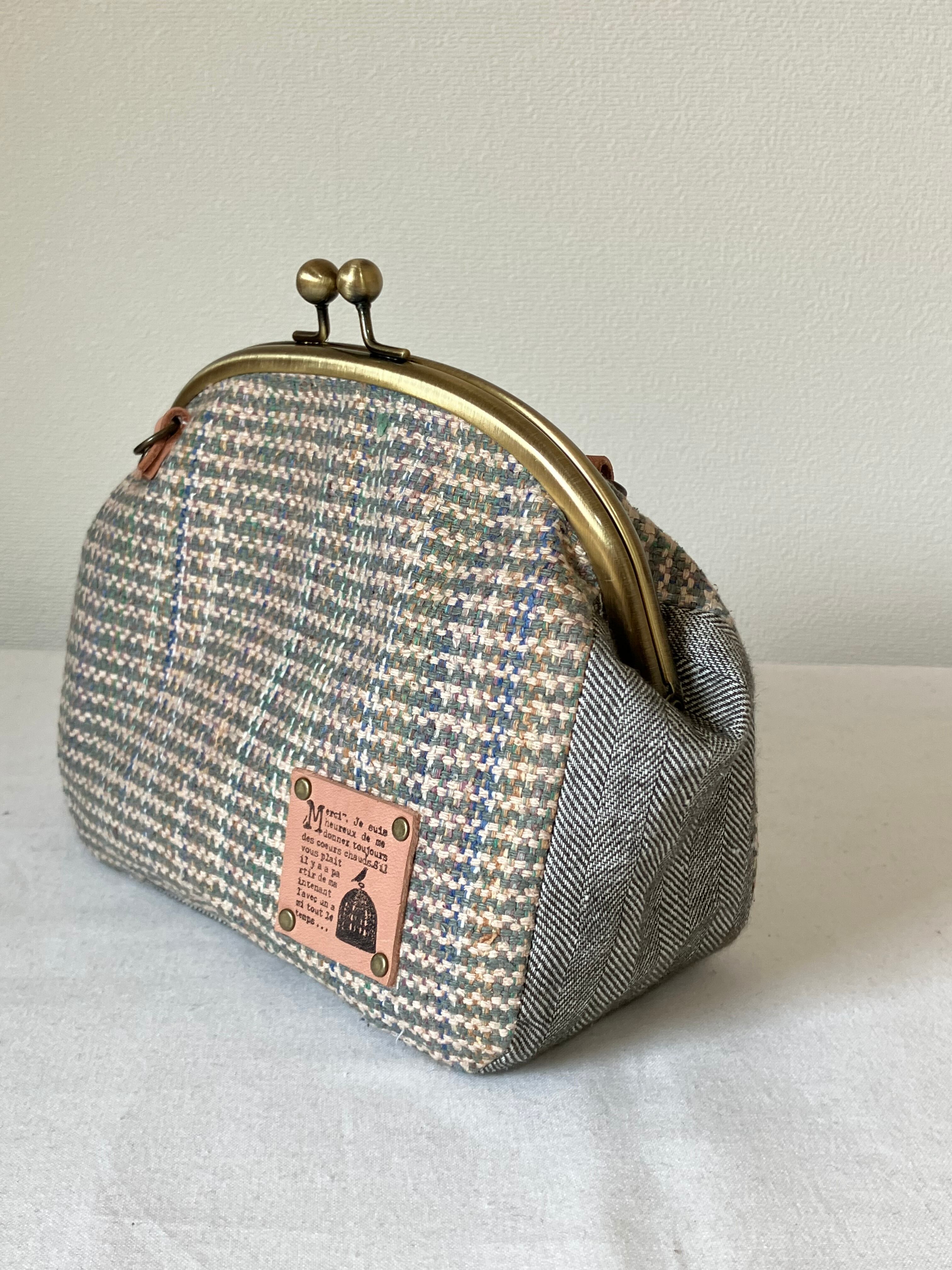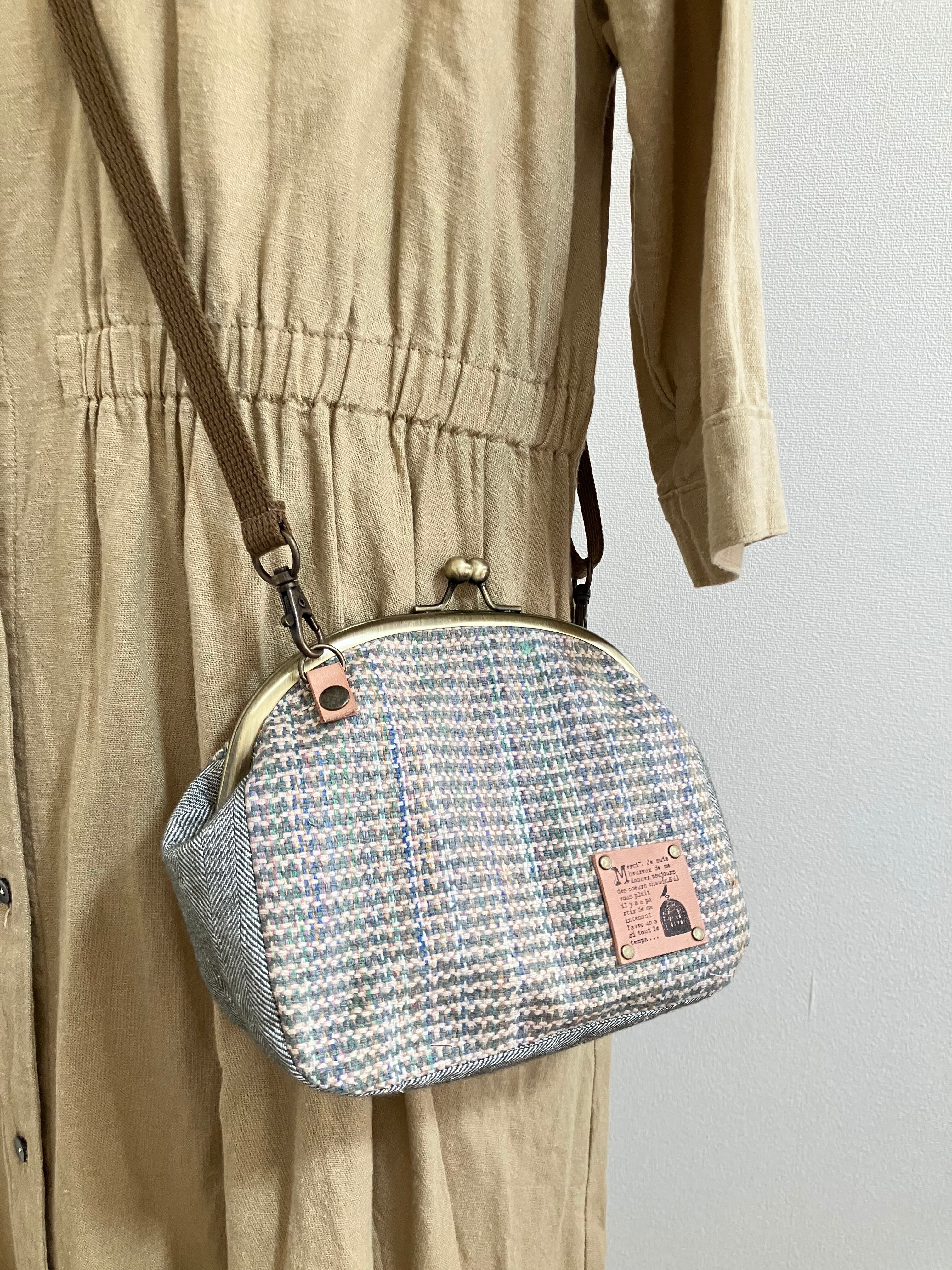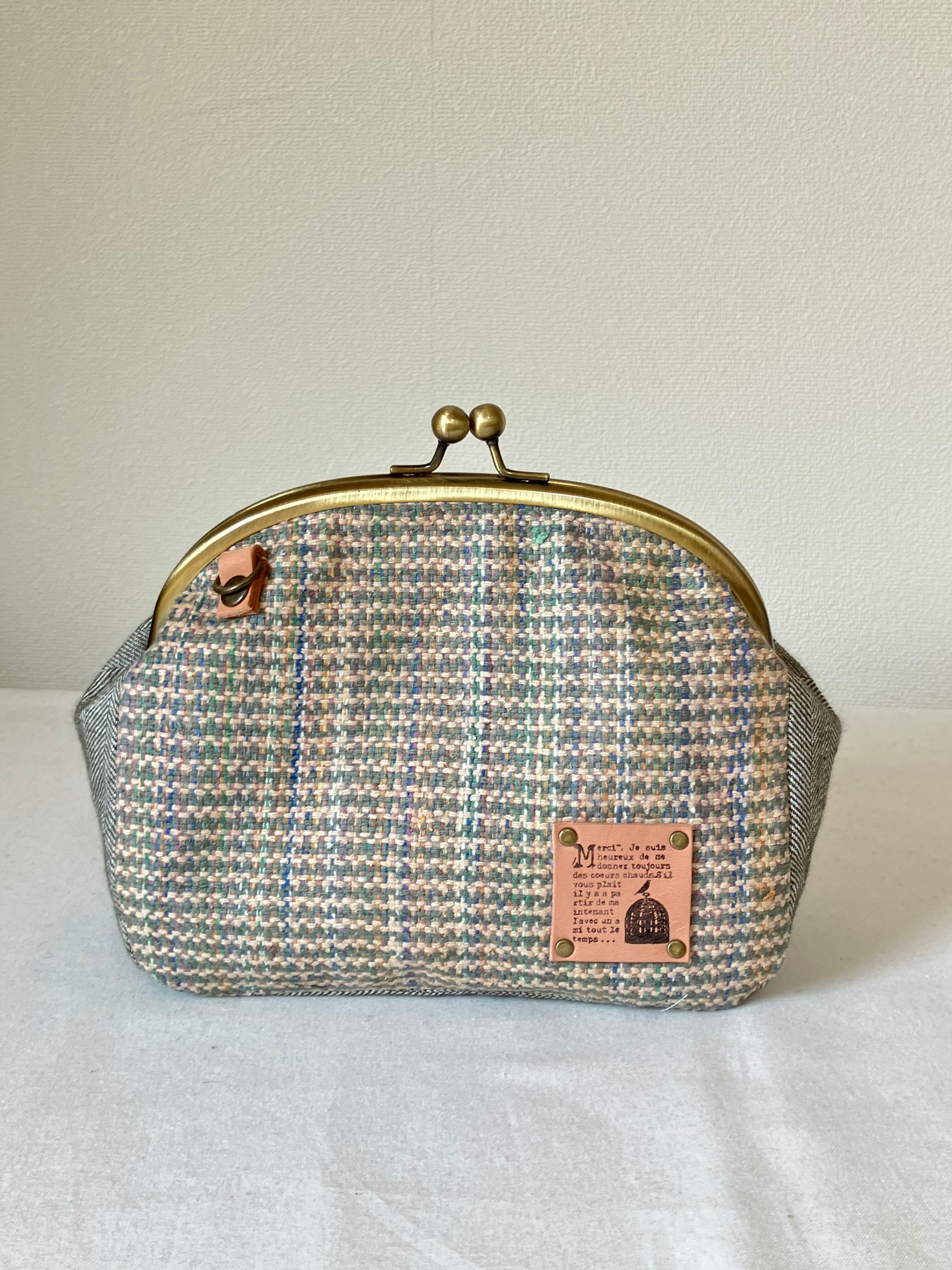 ■ グリーン系やベージュなどのミックスカラーのシルク混のコットン生地にマチ部分はコットンリネンのヘリンボーン生地を使っています。