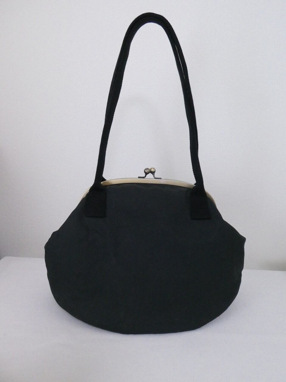 ・シンプルな黒1色の肩から提げられるがま口ハンドバッグです。